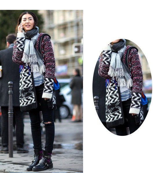 【搭配示范】:灰白格子圍巾+針織開(kāi)衫+緊身牛仔褲+鉚釘短靴