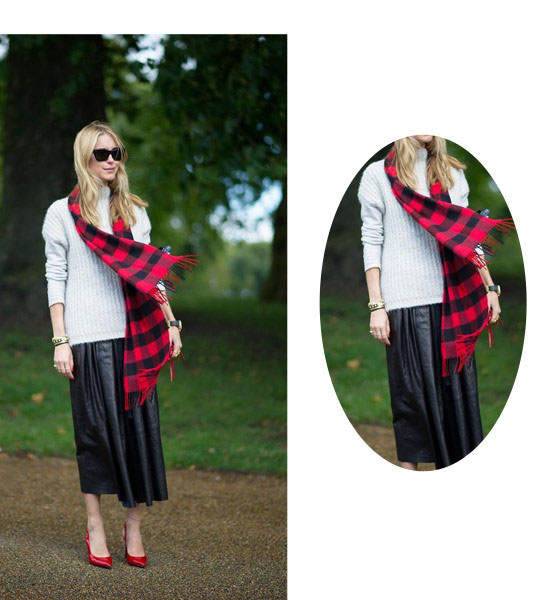 【搭配示范】:高領(lǐng)毛衣+半身長(zhǎng)皮裙+紅色格子圍巾+紅色尖頭高跟鞋