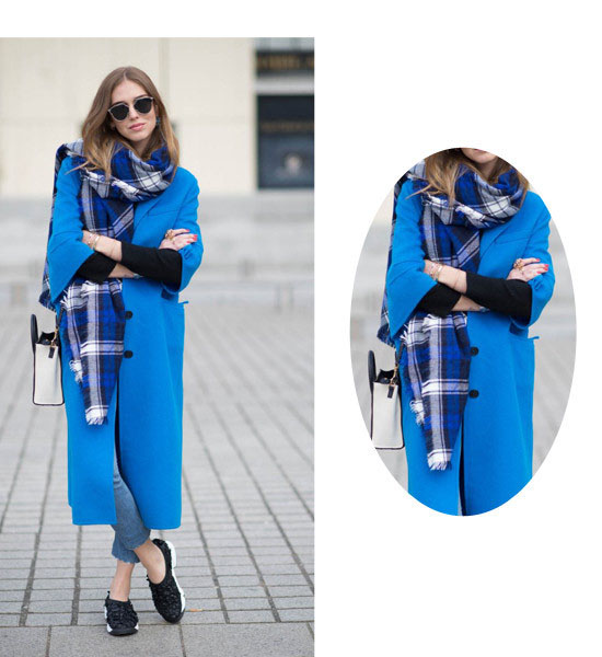 【搭配示范】:打底衫+藍(lán)色長(zhǎng)款大衣+緊身牛仔褲+運(yùn)動(dòng)鞋+藍(lán)色格紋圍巾+單肩挎包