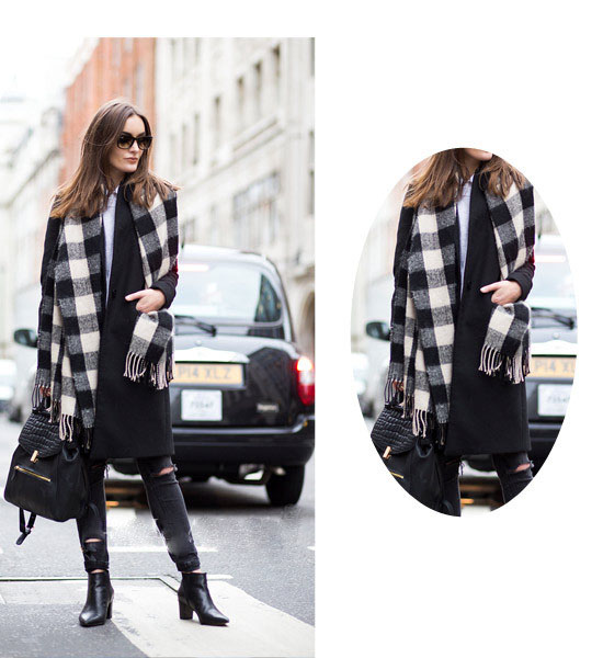【搭配示范】:白色襯衫+黑色呢子外套+黑色破洞牛仔褲+黑白格圍巾