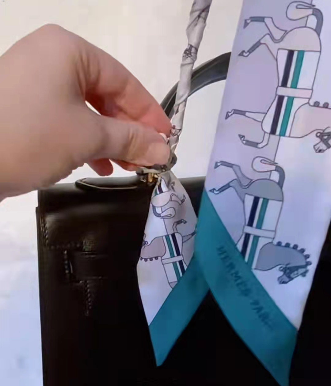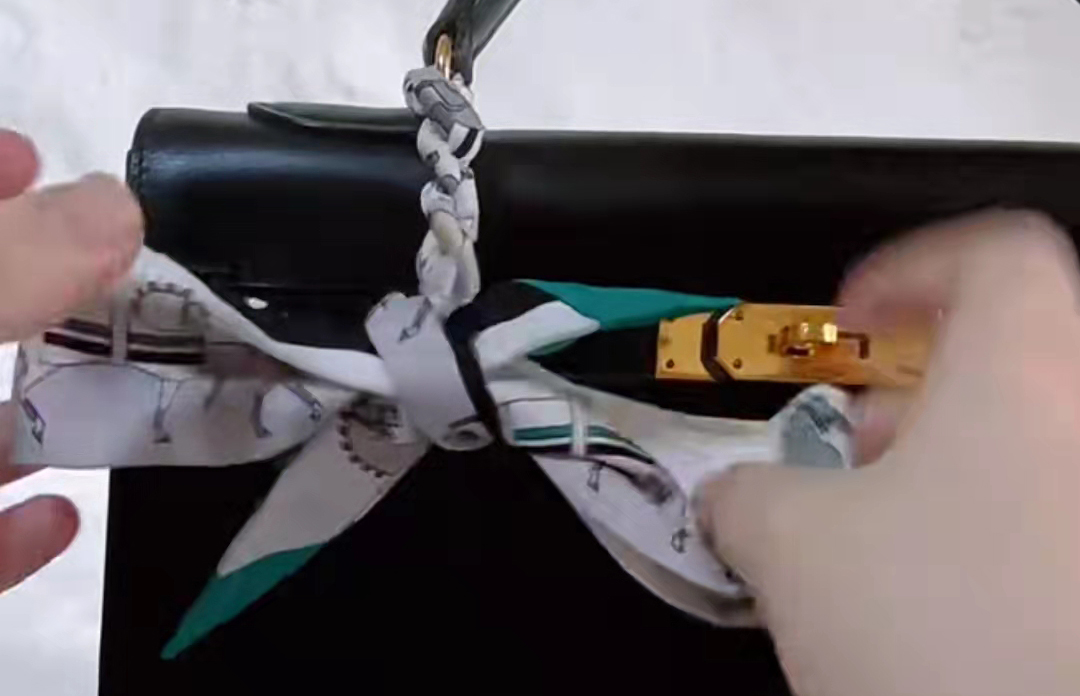絲巾在包柄中間對折,把絲帶交叉繞過包柄,注意一定要繃緊絲帶,系出來的辮子才會整齊不容易散,繞到底部的時候,把絲帶穿過金屬扣,然后打結。