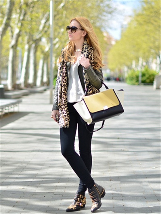 如果不敢嘗試大面積的豹紋單品,圍巾不失為一個最好的豹紋單品選擇,搭配軍綠色的外套和黑色緊身褲,塑造完美的女人身材。